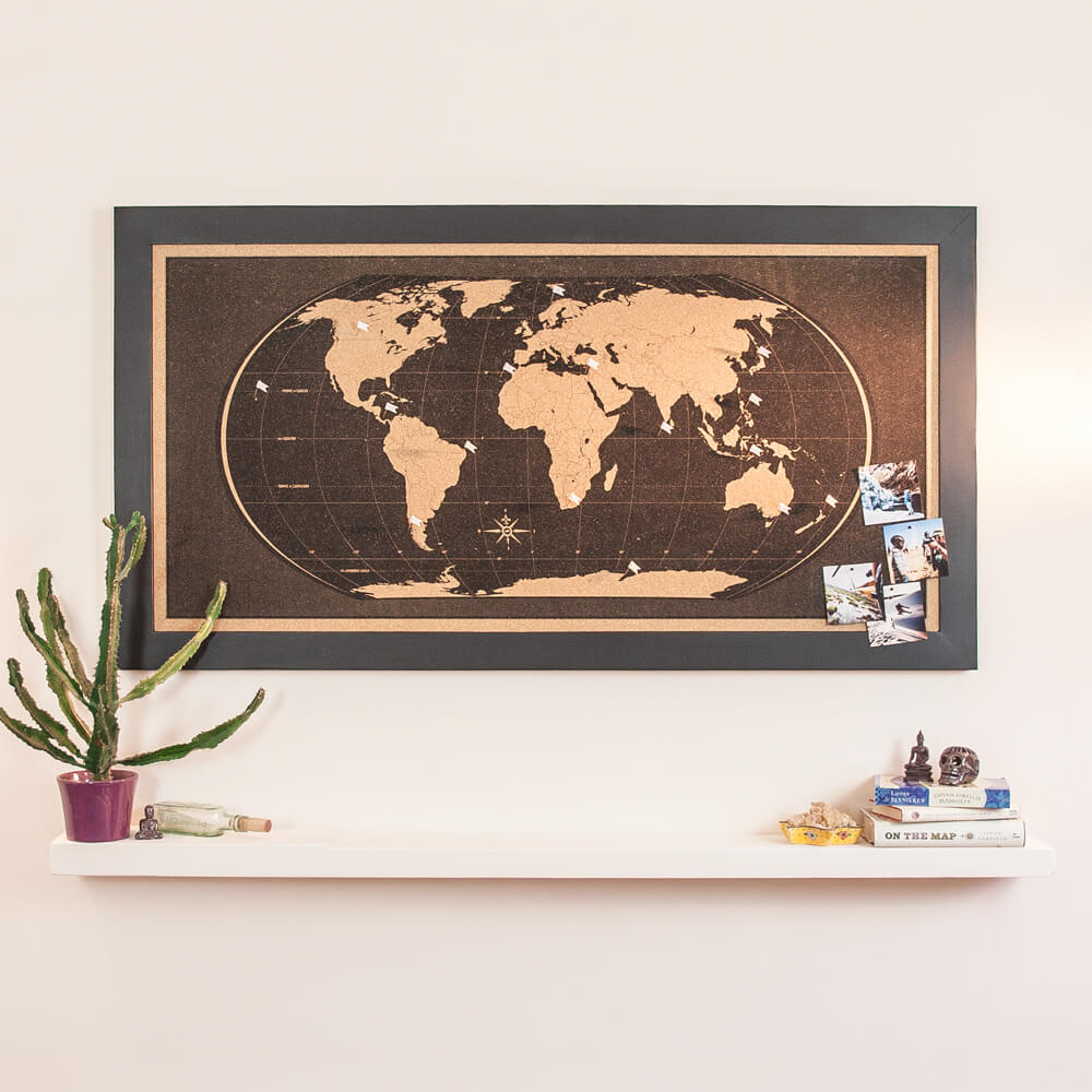 The meticulous design may go unnoticed, but these are skillfully and individually hand-pulled silkscreened maps, printed using water based inks for the finest detail and brightest colours possible on 100% sustainable cork, with a recycled pin-retaining softboard core. Designed with no location names our world map simply shows the longitude, latitude and equators, with country borders printed as finely as possible – so that at a distance you won't notice them, and up close you can see each country. They also feel great!