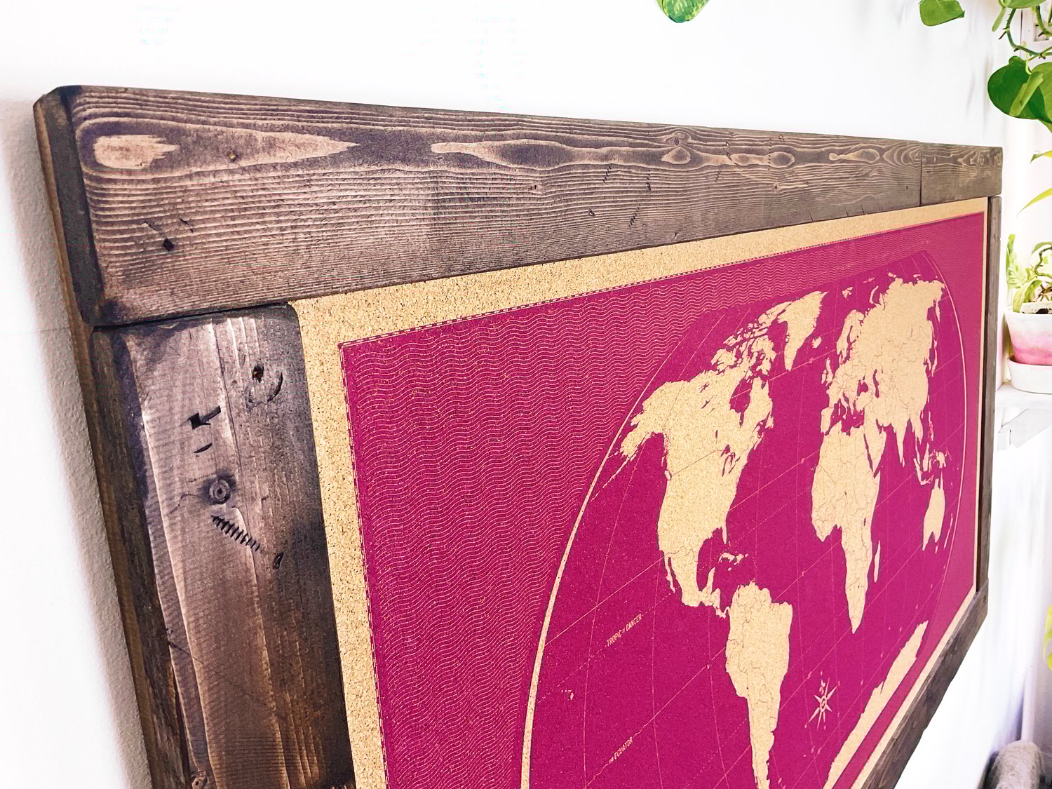 The meticulous design may go unnoticed, but these are skillfully and individually hand-pulled silkscreened maps, printed using water based inks for the finest detail and brightest colours possible on 100% sustainable cork, with a recycled pin-retaining softboard core. Designed with no location names our world map simply shows the longitude, latitude and equators, with country borders printed as finely as possible – so that at a distance you won't notice them, and up close you can see each country. They also feel great!